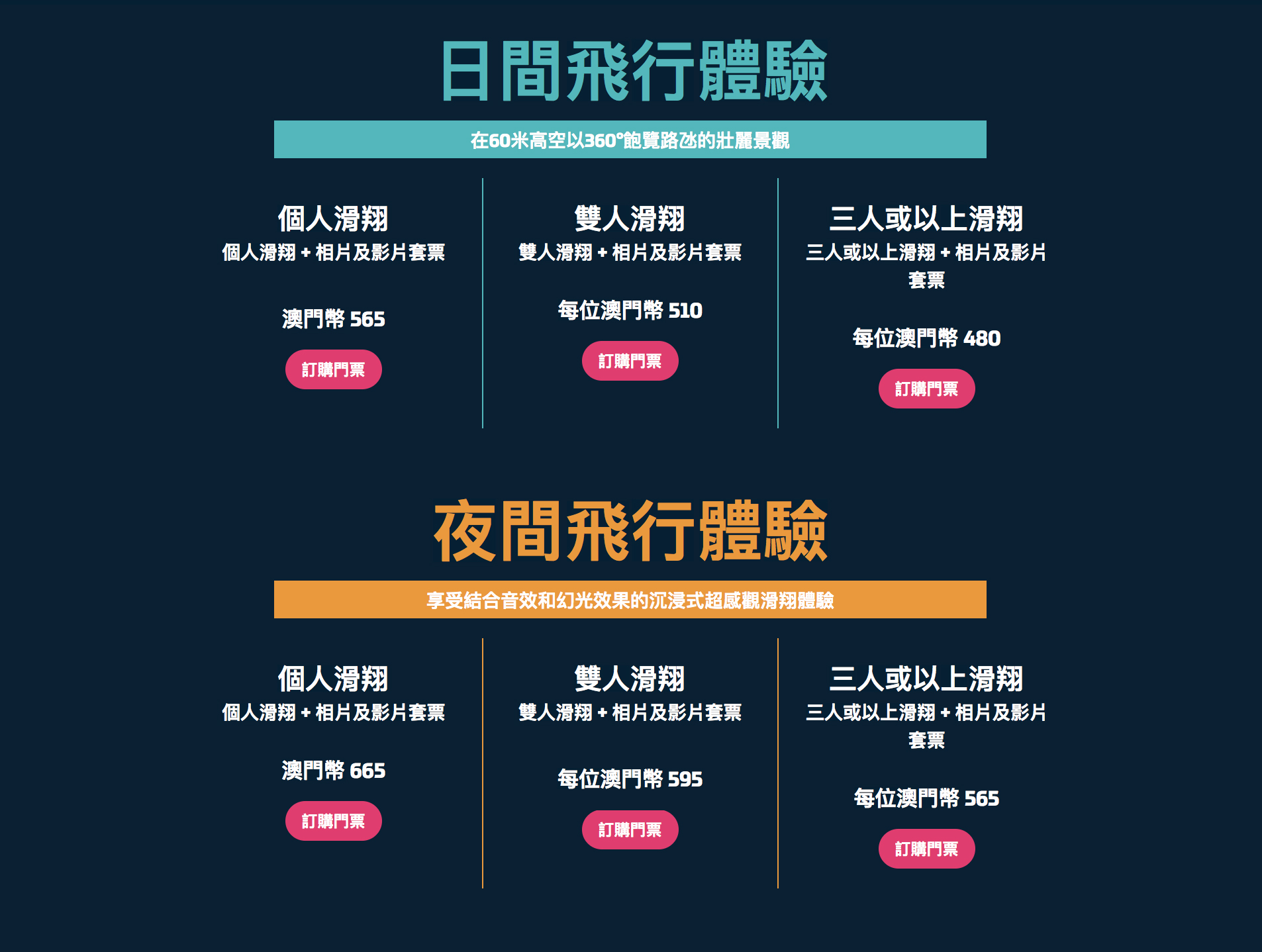 澳門飛索整天營運及設有日間和夜間飛行體驗,歡迎個人或團體參予。選擇日間飛行的您,可以在高空全方位飽覽路氹金光大道的壯麗景色,選擇夜間飛行則可享受世界級一流的超感官視聽娛樂,經歷刺激震撼的沉浸式飛索旅程。
