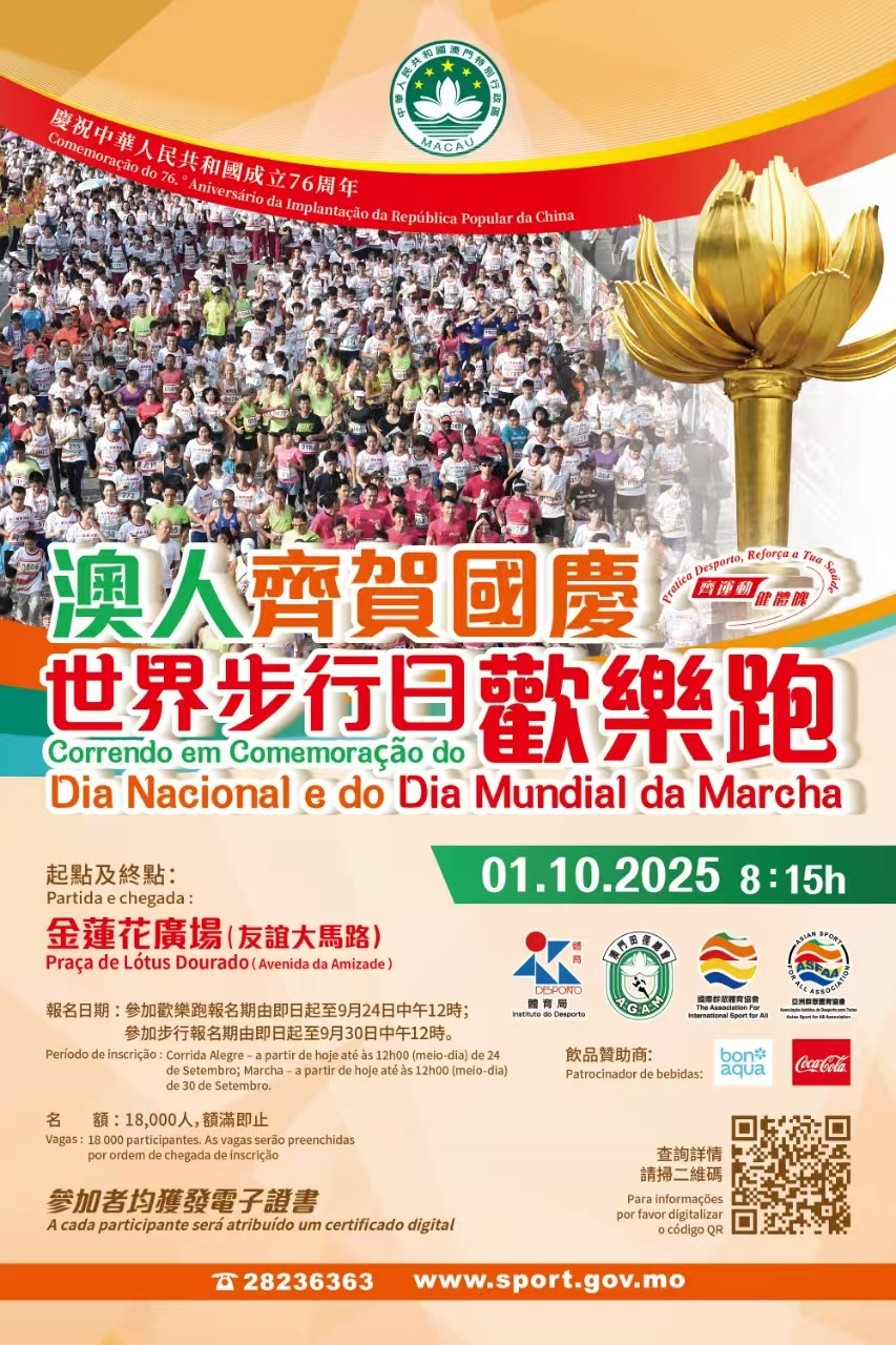 這個國慶,誠邀您參加「2025澳人齊賀國慶世界步行日歡樂跑」!一起在陽光下揮灑汗水,感受節日的喜悅與健康的活力~無論你是長跑愛好者,還是喜歡悠閒健行,這都是一個絕佳的機會,既能強身健體,又能結識新朋友。活動中不僅可以展現個人風采,還能參與團隊競技,挑戰個人最佳紀錄,爭奪團體總冠軍——每一步都充滿鬥志與驚喜!讓我們以活力滿滿的腳步,共同歡慶國慶,一起跑出健康、跑出歡樂!