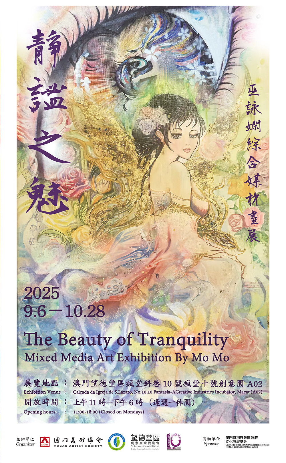 由澳門美術協會、澳門青年美術協會、望德堂區創意產業促進會及瘋堂十號創意園主辦,並獲澳門特別行政區政府文化發展基金資助的《靜謐之魅》—巫詠嫻綜合媒材畫展將於2025年9月6日-10月28日在澳門望德堂區瘋堂斜巷10號瘋堂十號創意園A02室展出多幅綜合媒材作品。