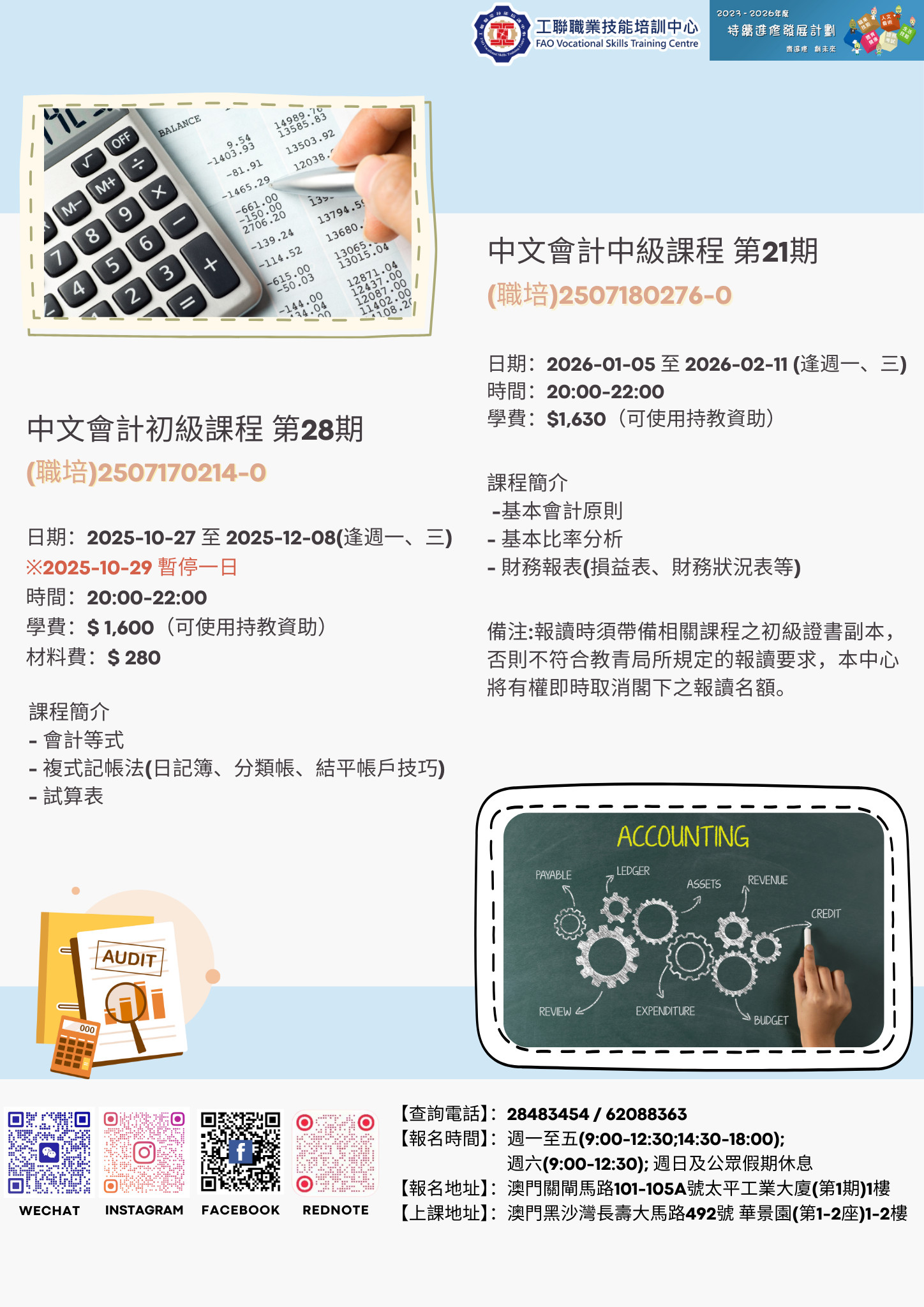 中級課程:獨資企業的財務報表、基本會計原則及慣例、基本比率的分析等。