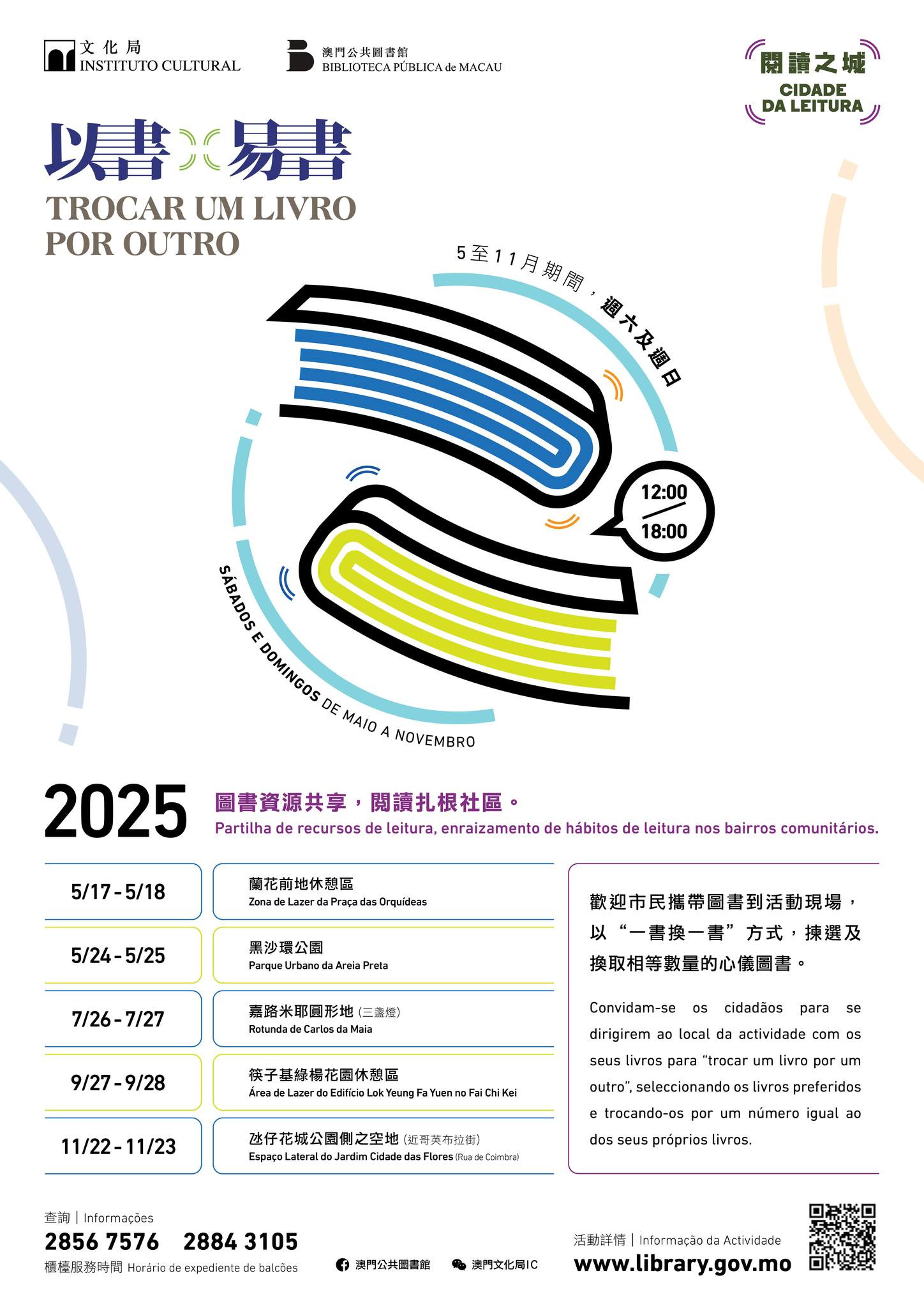 為了傳遞“閱讀豐富生活”的理念,文化局去年首次推出的“以書易書”活動深受市民歡迎及支持。這個周末“以書易書”活動將於黑沙環公園 (露天廣場)再次舉辦。